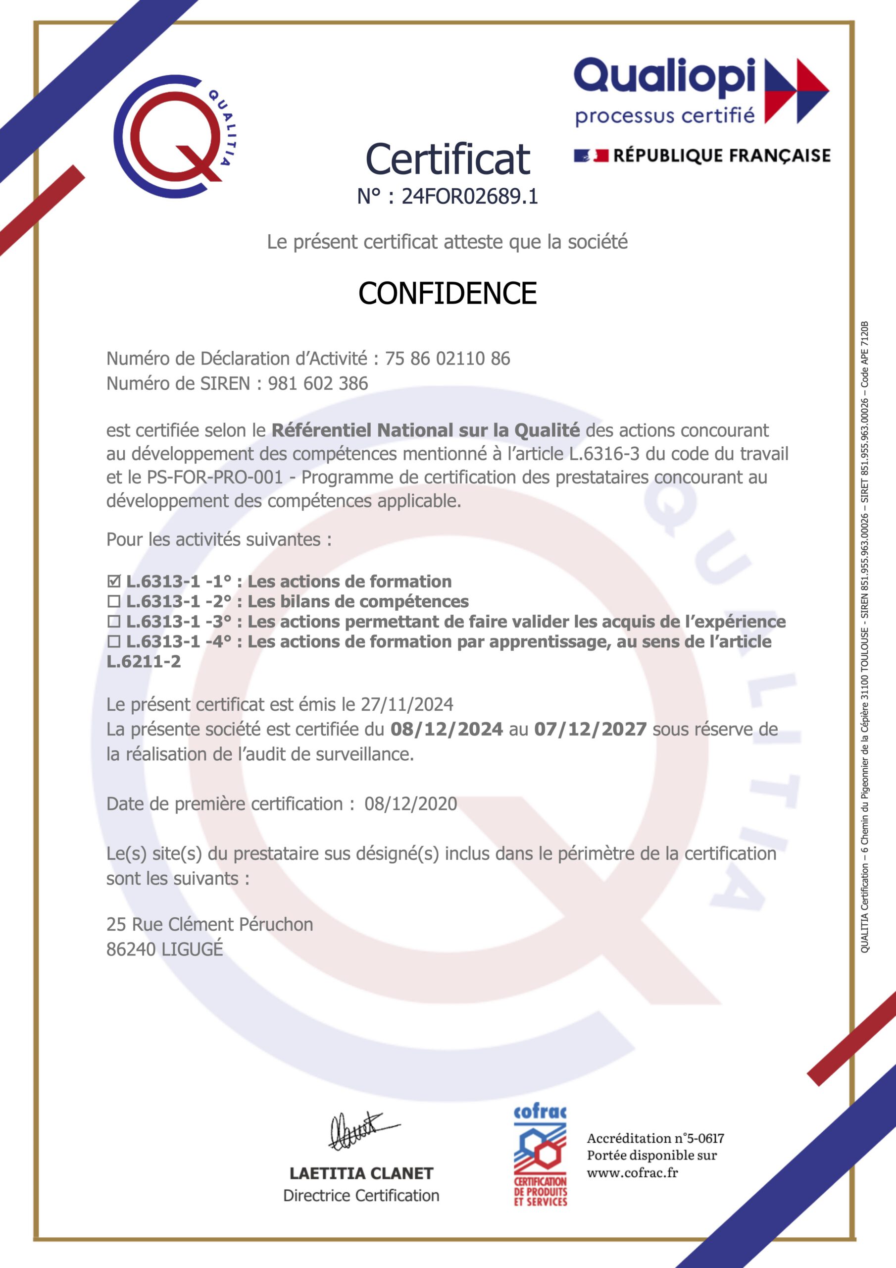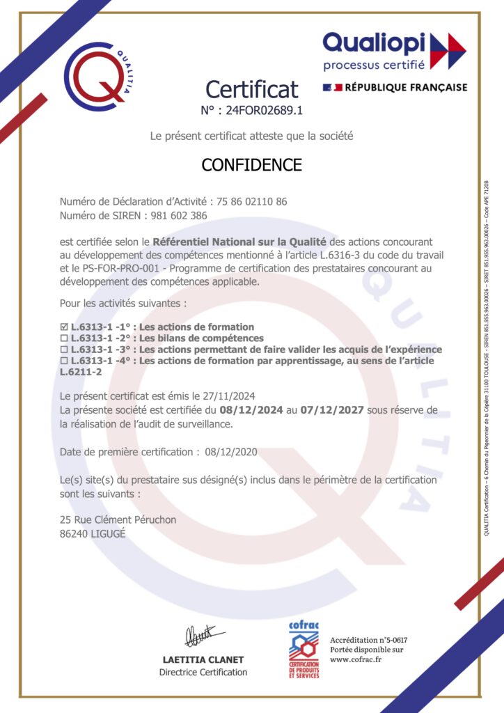 Depuis décembre 2020, CONFIDENCE est certifié Qualiopi, une reconnaissance officielle de mon engagement dans une démarche qualité rigoureuse et continue.